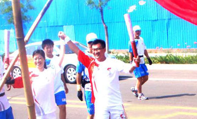 圖為火炬手汪英杰手持火炬傳遞