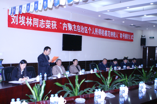 頒獎儀式上,蒙西地方稅務分局賀占忠局長宣讀了自治區地稅局的表彰決定,集團公司副總裁包雙江代表劉總接受了榮譽證書和牌匾,集團公司高級會計師靳文同